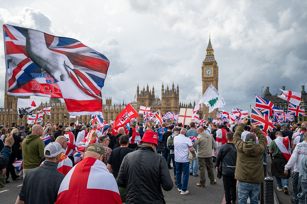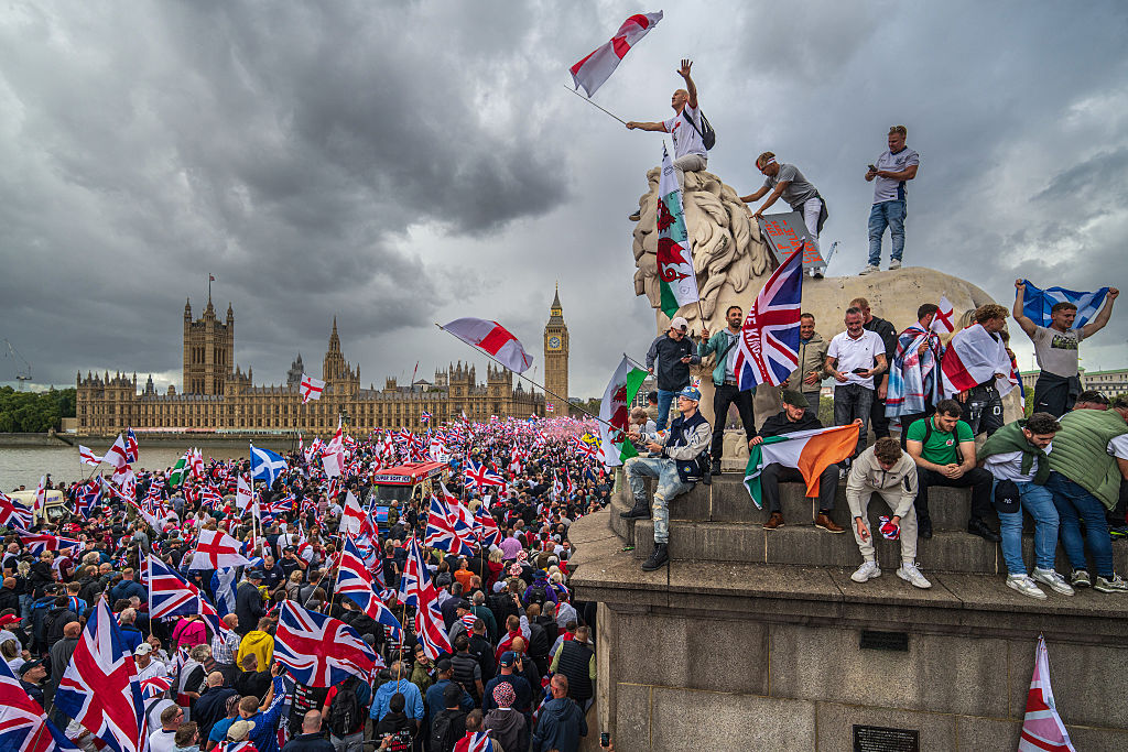 Aerial footage captured rivers of red, white and blue surging past Parliament, with chants of “Oh Tommy Tommy” mingling with calls to “send them back” – pointed barbs at small-boat crossings and what some perceive as unchecked immigration.