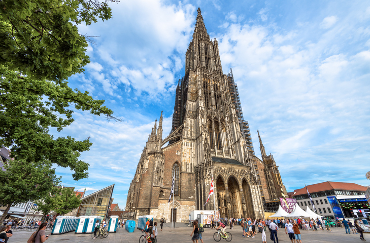 The Ulm Minster – whose tower shoots up to 161.53 metres – was the world’s tallest church since 1890, surviving unscathed the bombardments of the Second World War, which destroyed large parts of the surrounding city.