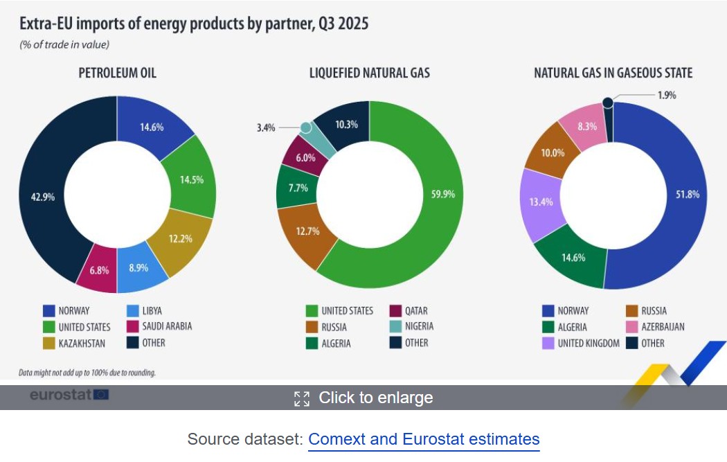 In the first nine months of 2025, the average monthly value of petroleum oil imports into the EU fell by 18.3 per cent, while the value of LNG imports rose sharply. In the third quarter of 2025, almost 60 per cent of the EU’s LNG imports came from the United States. Russia accounted for only 12.7 per cent, while Algeria supplied 7.7 per cent.